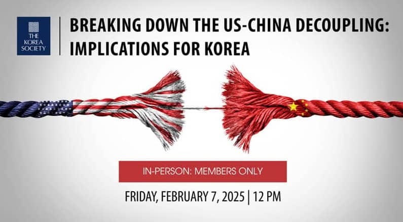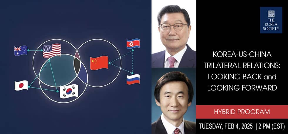 On February 7th, we held a members-only roundtable for a discussion on the evolving US-China economic relationship and its implications for Korea. Speakers included Benjamin Qiu, US-China business expert and NYC-based lawyer, and Kenneth Wilcox, author of The China Business Conundrum and former CEO of Silicon Valley Bank. This program is co-hosted by the Asian Affairs Committee of the New York City Bar Association, and moderated by Thomas Byrne, President and CEO of The Korea Society.