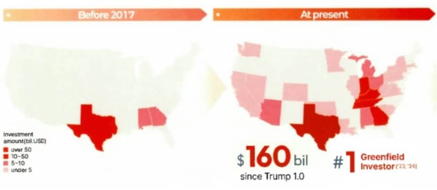 The top two panels show that not only is foreign direct investment (FDI) by Korean firms in the U.S. reaching new heights, but it is also reaching into a wider range of states across the nation. The job-creating benefits of the K-investment wave are building new constituencies which support a stronger economic relationship between the U.S. and Korea. The sources of these two images comes from a presentation made by the six-member ROK National Assembly delegation, led by Rep. Cho Kyoung-tae, to The Korea Society on February 14, 2025.
