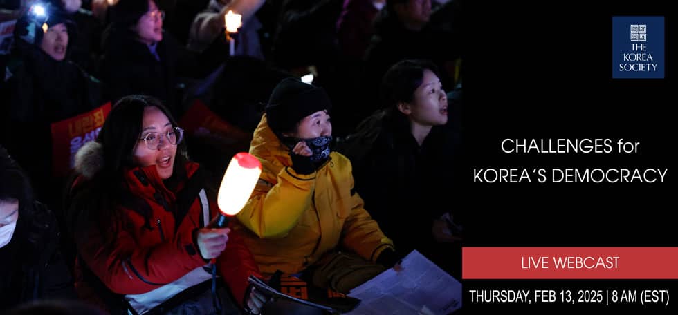 The Korea Society hosted a conversation on February 13th about the fallout from the Yoon Suk Yeol administration and challenges to South Korea’s democracy with Kelly Kasulis Cho, Washington Post Breaking News Reporter, Andrew Yeo, senior fellow and the SK-Korea Foundation Chair at the Brookings Institution's Center for Asia Policy Studies, and Daniel Sneider, lecturer in East Asian Studies at Stanford.