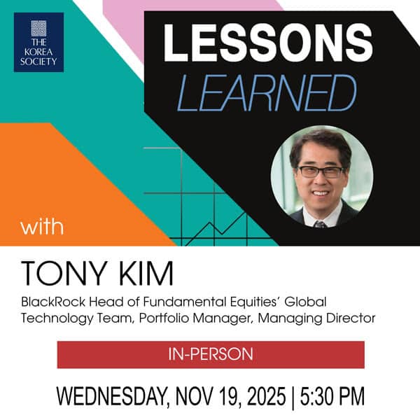 The Korea Society hosted a Lessons Learned program, co-hosted by the Korea Finance Society (KFS), on November 19th featuring Tony Kim, Head of BlackRock’s Global Technology Equities Team. In conversation with Helena Chao (Bank of America), he shared insights from his career in global equities and tech investment management and offered practical guidance on navigating careers in a fast-changing, competitive field.