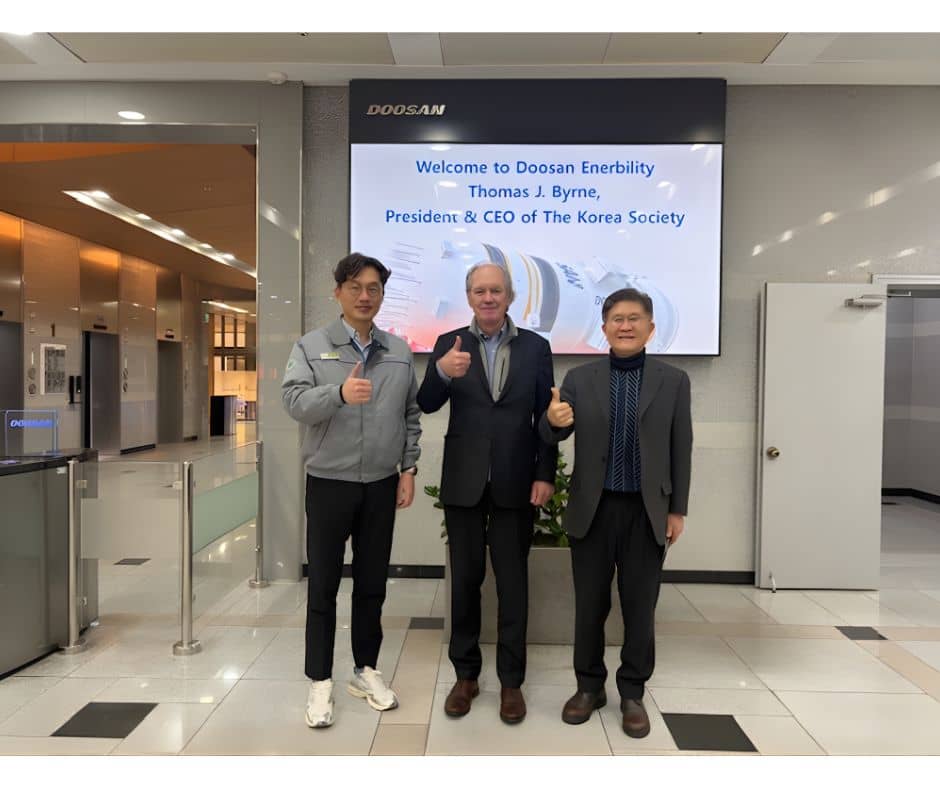 X-energy Reactor Company, Rockville, Maryland, and Doosan Enerbility Company signed a binding Reservation Agreement on December 18, 2025 for the manufacture of components for 16 “SMRs” (small modular reactors). The agreement will support a global industrial supply chain capable of deploying new nuclear power generation capacity at scale. As part of the agreement, Doosan has committed to construct a new, state-of-the-art SMR fabrication facility in Changwon, South Korea. Doosan Enerbility is positioning itself to be a leading global manufacturer in the emerging SMR industry. Mr. Changhoon Ha, Nuclear Power Plant and SMR Project Director, gave a tour of Doosan Enerbility’s complex in Changwon to Mr. T.S. Chung, Country Director, Korea, Utah Governor’s Office of Economic Opportunity Asia and The Korea Society’s Tom Byrne on December 17, 2025.