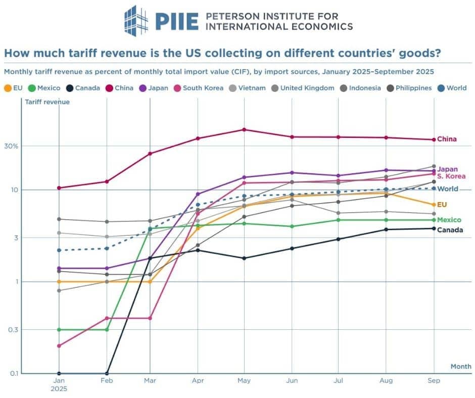 High tariffs are a new political and economic reality in trading relations under President Trump. How much tariff revenue is the U.S. collecting on a country's goods? An analysis done by the Peterson Institute of International Economics shows that monthly tariff revenue as percent of monthly total import value (CIF) of goods sent from South Korea is 15.0% (September 2025). Although lower than China’s 35.2%, tariffs are higher for Korean imports than the World average of 10.4%. This puts Korea at a competitive disadvantage with countries whose effective tariff rates are lower. Tariffs are taxes collected by the US government from US businesses when they import goods. Although tariff revenue has recently surged, it accounted for only about 4% of total federal revenue, compared with 51% from individual income tax in fiscal year 2025. For insights on tariff policy, please see The Korea Society’s December 8 program, U.S.-Korea Economic Relations in a New Tariff Era: Economic and Industrial Perspectives, which featured a keynote address by Dr. Maurice Obstfeld, former Chief Economist of the International Monetary Fund and one of the most influential voices in global macroeconomics.
