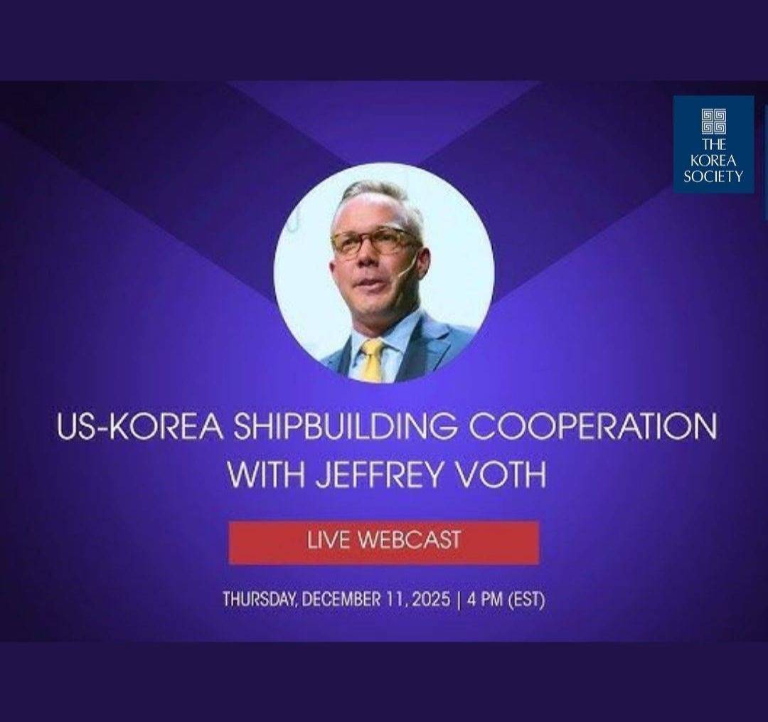 On December 11th, we were joined for a conversation on the obstacles and pathways for enhanced US-Korea shipbuilding cooperation by Jeffrey Voth, President of Herren Associates, Inc. and author of the recent article, "The US-ROK test case: Can visas and rules unlock American shipbuilding?" Drawing on decades of shipbuilding and combat system integration experience, Jeffrey Voth discusses construction challenges and allied collaboration opportunities in conversation with Korea Society policy director Jonathan Corrado.