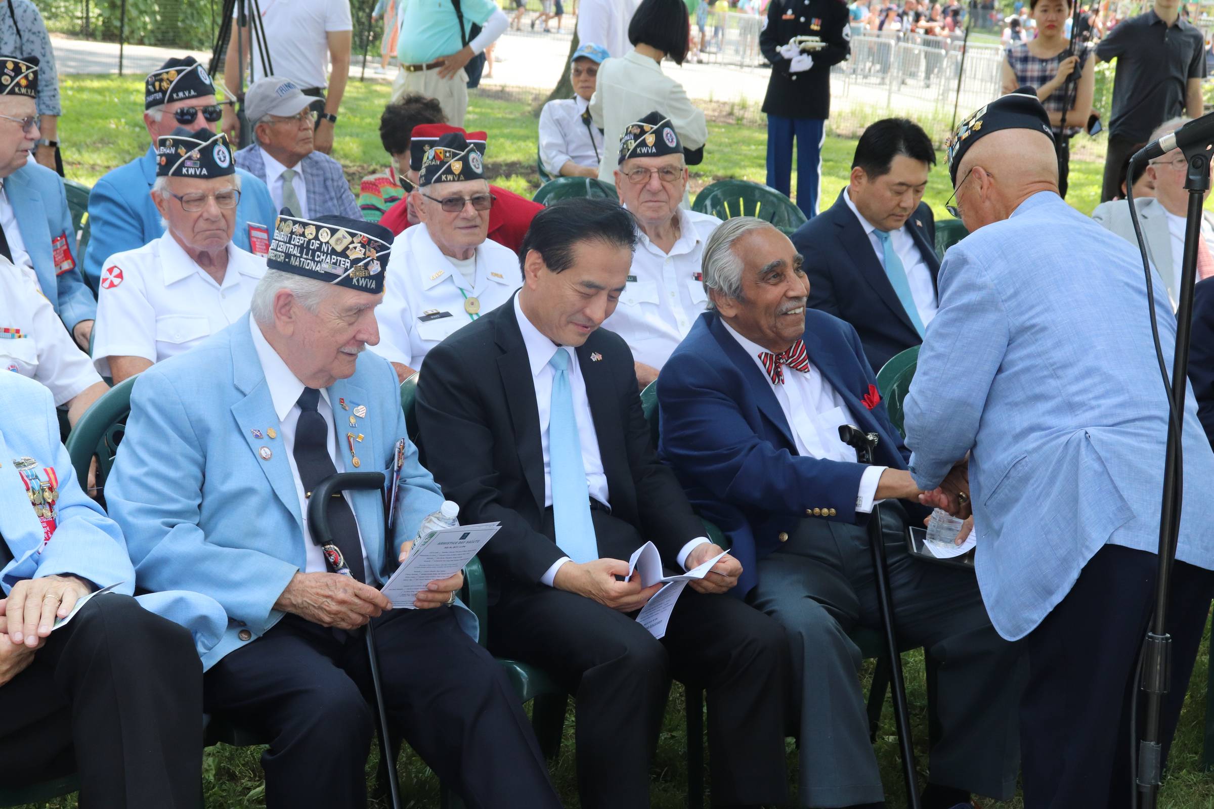 Congressman Rangel greeting veterans of the Korean War during the 2019 Korea Society Armistice Day Commemoration