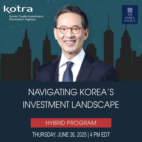 This conversation was moderated by Tom Byrne, President and CEO of The Korea Society and Honorary Ambassador for Foreign Investment Promotion for Korea. This program was cohosted by the Korea Trade-Investment Promotion Agency (KOTRA).